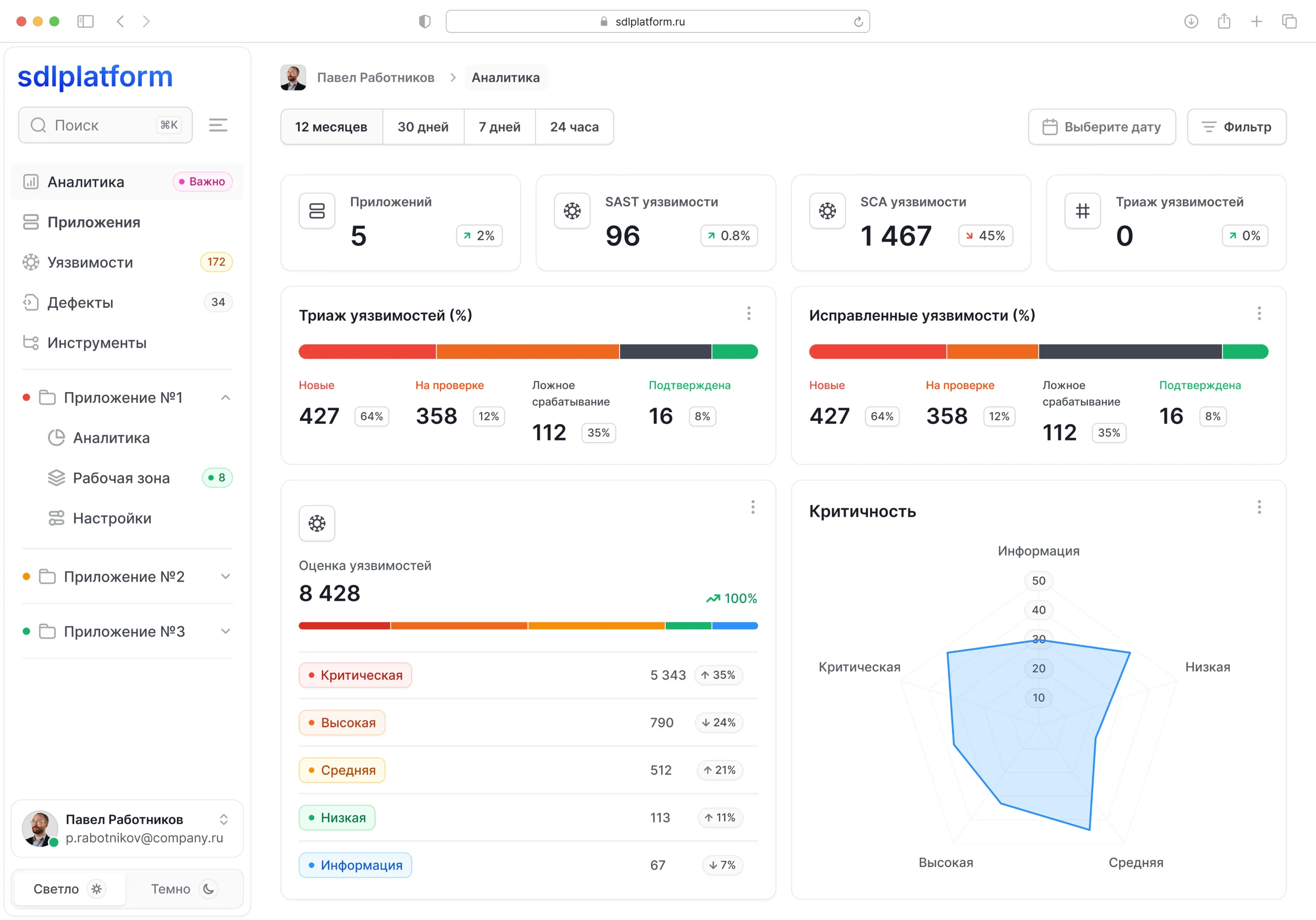 Общая аналитика по приложениям: динамика, распределение по критичности, тренды, графики и сравнение версий